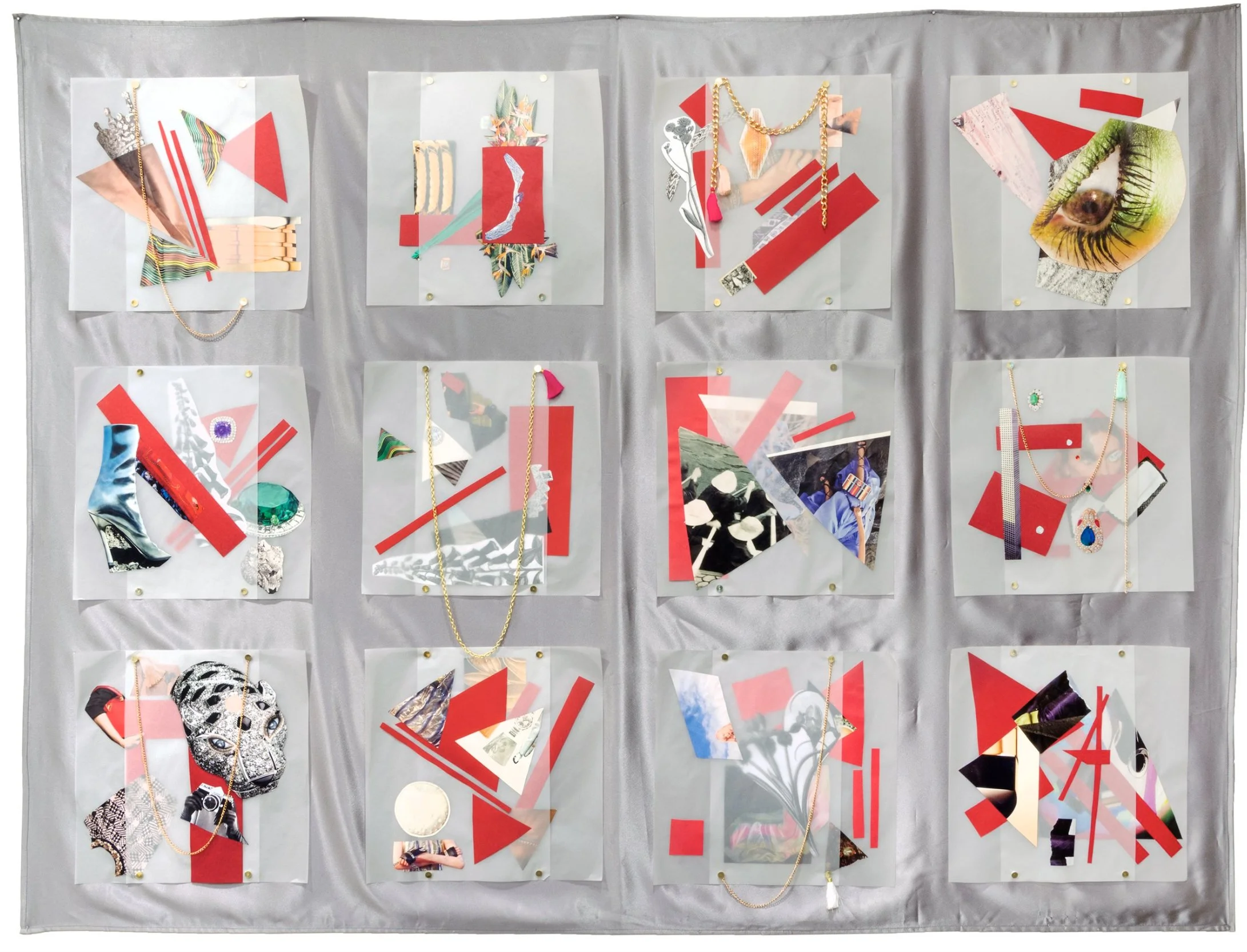 All is for the best… is composed of square collages arranged with fragments of imagery cut from luxury high-fashion magazines and interspersed with geometric shapes of red paper. The 12 collages are unified into a gridded composition with a shimmering backing of silver fabric and embellished with jewelry chains and tassels. The work’s layered iconography combines elements reminiscent of the “mood” or “vision” boards used in the development of interior decorating schemes and advertising campaigns. The collaged composition suggests symbolic ranking motifs of military uniform and the dynamic geometries recall early 20th century constructivist design. In mixing the aspirational motifs of luxury goods, military uniforms and the visual language of the avant- guard, putting forth a shaded critique of the way the economies of desire militantly reinforce the status quo and use the desire to accumulate more beauty as the most noble of ideals.